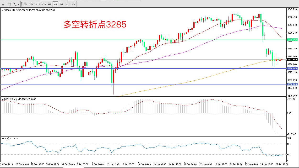 4小时图看,标普500低开低走跌破200周期均线,整体走势十分低迷短期均线拐头,MACD绿柱增加,RSI指标走平,日内延续下行概率较大