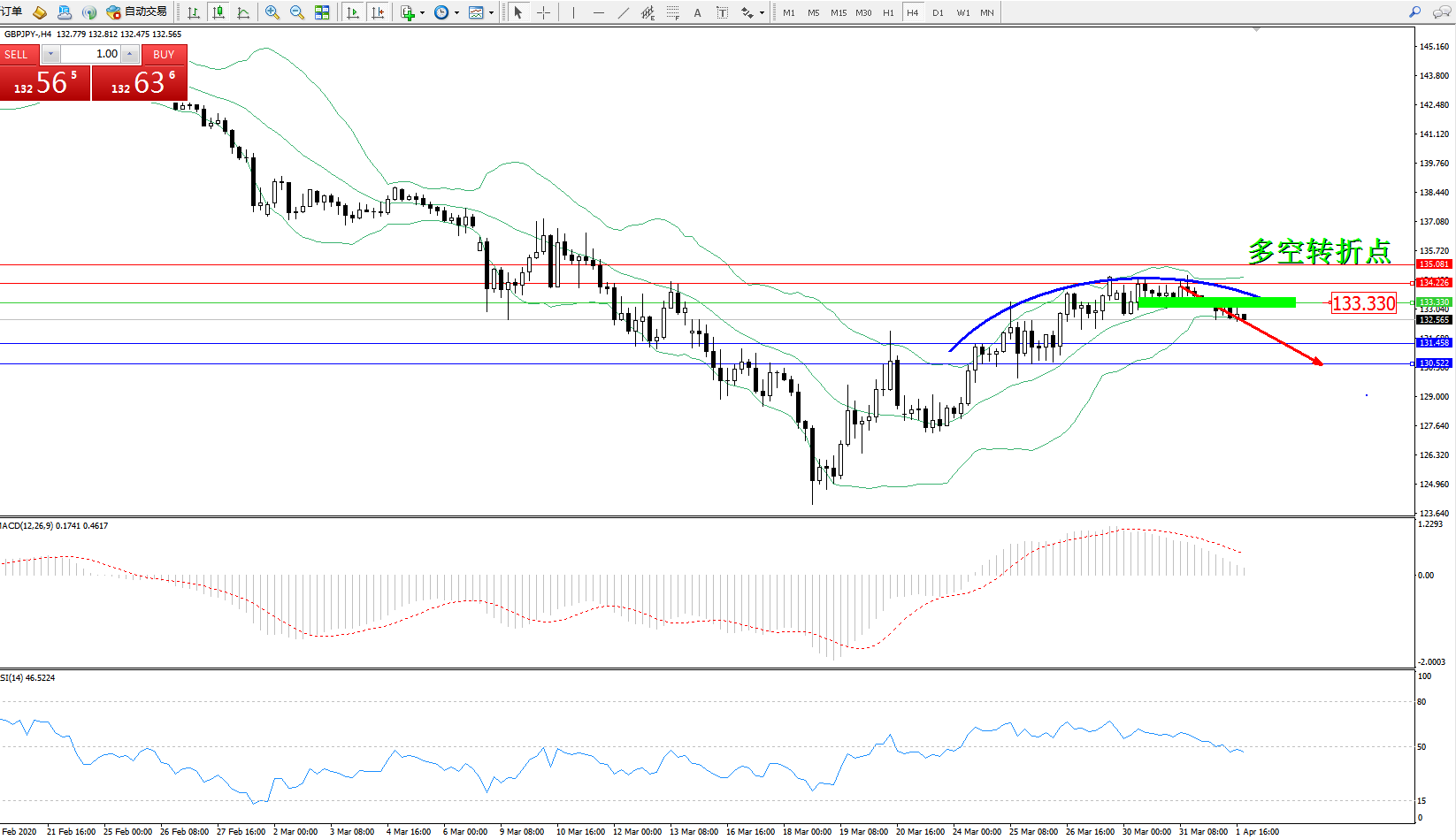 交易策略:133.330下方看跌,目标131.458130.522