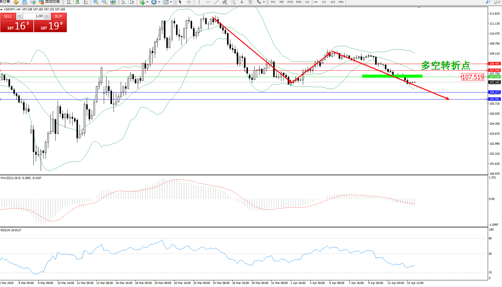 交易策略:107.519下方看跌,目标106.472105.991