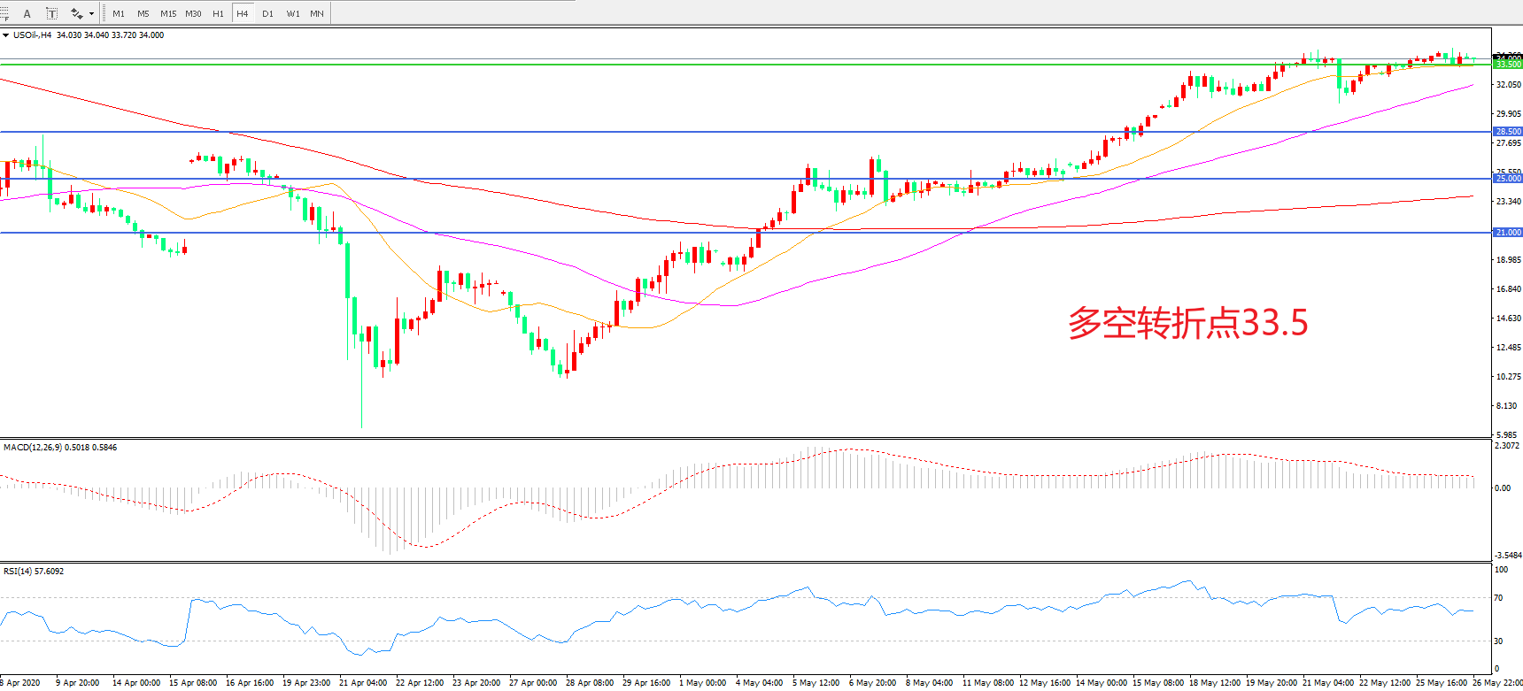 4小时图看,油价延续高位震荡,33.5成为争夺焦点,55周期均线逐步走高,MACD红柱走平,RSI指标向上,日内延续震荡概率较大。