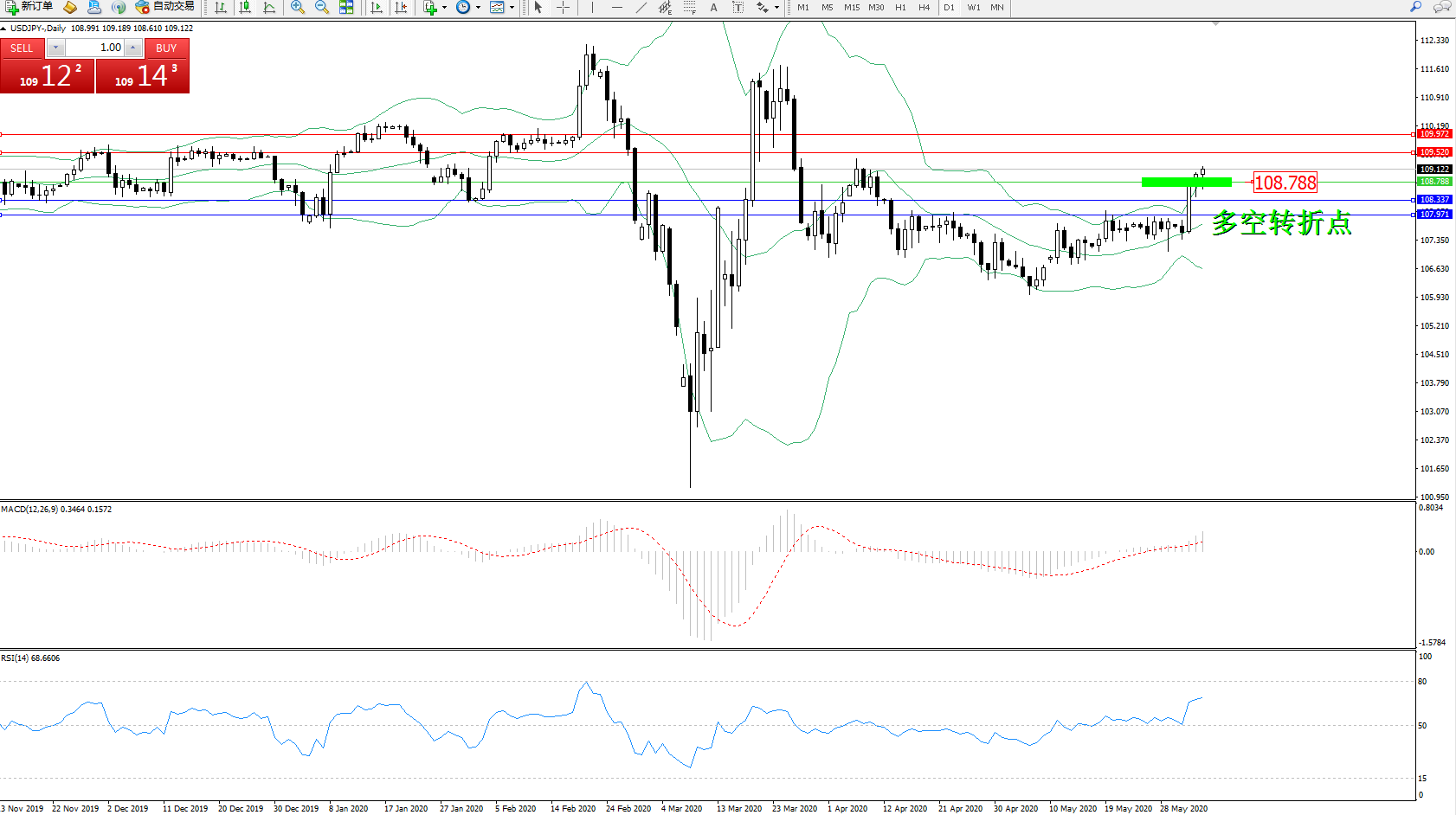 技术点评:多头动力强势拉升上行后延续布林带指标上轨附近不断震荡上扬中,布林带指标呈张口走势中,上行潜力持续,有进一步拉升态势,MACD指标处于0轴线上方多头区域持续震荡震荡上移,RSI指标处于50均衡线上方多头区域强势拉升上移后开始震荡;