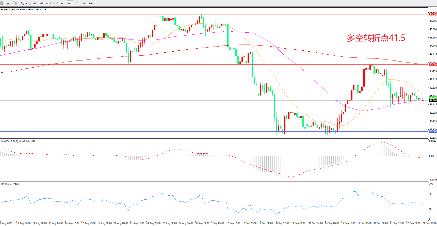 4小时图看,油价以41.5美元为依托延续震荡,整体波幅较小,均线系统走平,MACD红柱减少,RSI指标走平,日内延续震荡概率较大。