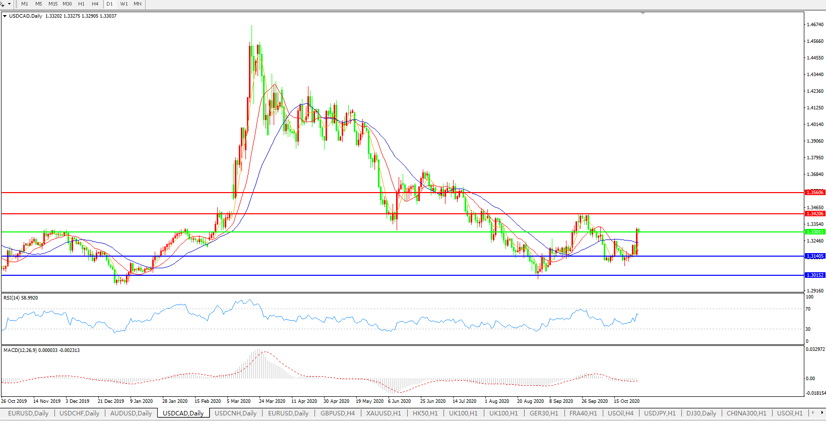 技术面简析:日图短期均线迅速走强,汇价持续反弹走高,MACD运行于0轴下方但量能持续缩量,RSI震荡走升,预计短期汇价大概率将在反弹后进一步下行。