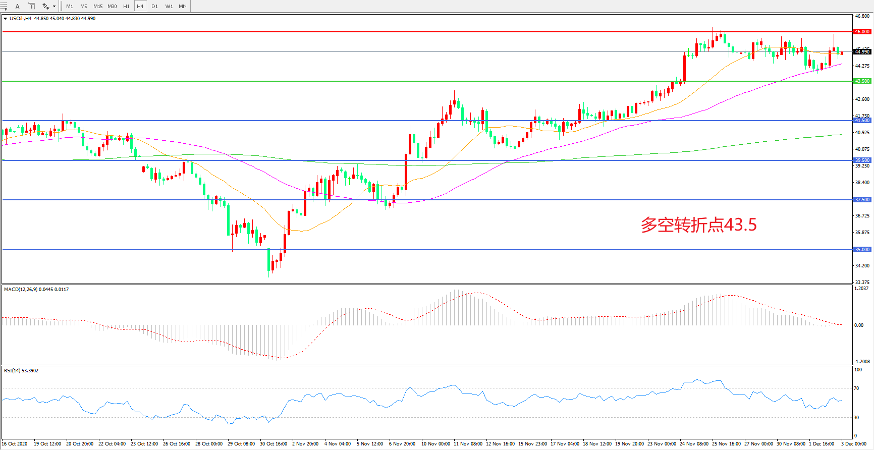 4小时图看,油价延续高位震荡,整体表现相对强势,55周期均线成为短期支撑46美元成为中期阻力MACD红柱减少,RSI指标走平,日内延续震荡概率较大。