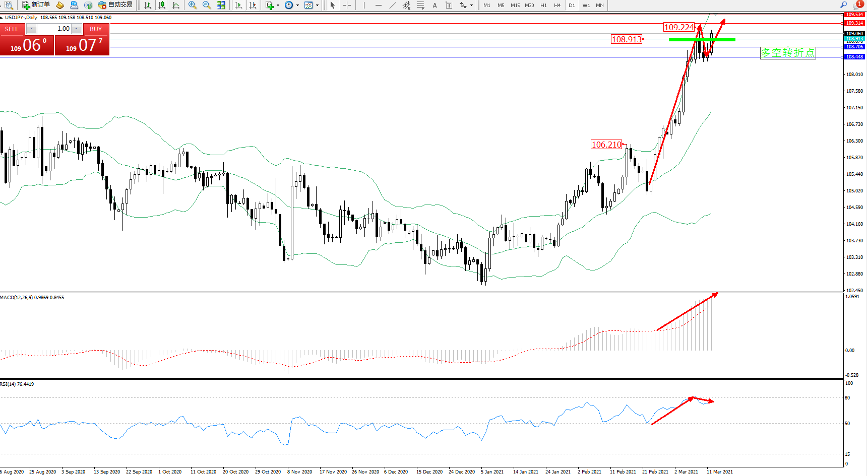 技术点评:多头动力延续布林带指标通道上轨附近节点持续震荡上扬,高位纠结于109.224附近节点后持续有拉升上行态势,之前高位近在咫尺破位在即,布林带指标呈张口走势后不断有上移迹象,MACD指标处于多头区域高位不断震荡上移,RSI指标处于80均衡线下侧弱势徘徊中;
