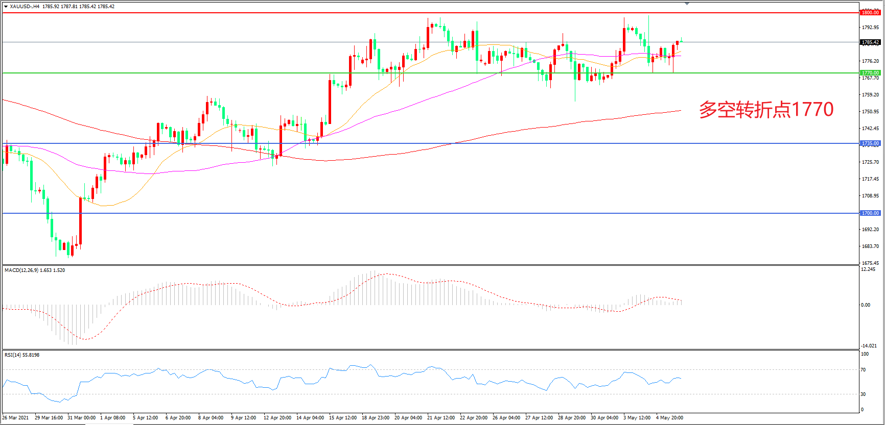 4小时图看,金价回踩1770后再度反弹,区间震荡迹象明显,1770成为下方支撑,1800成为上方阻力,均线系统走平,MACD红柱增加,RSI指标向上,日内震荡上行概率较大。