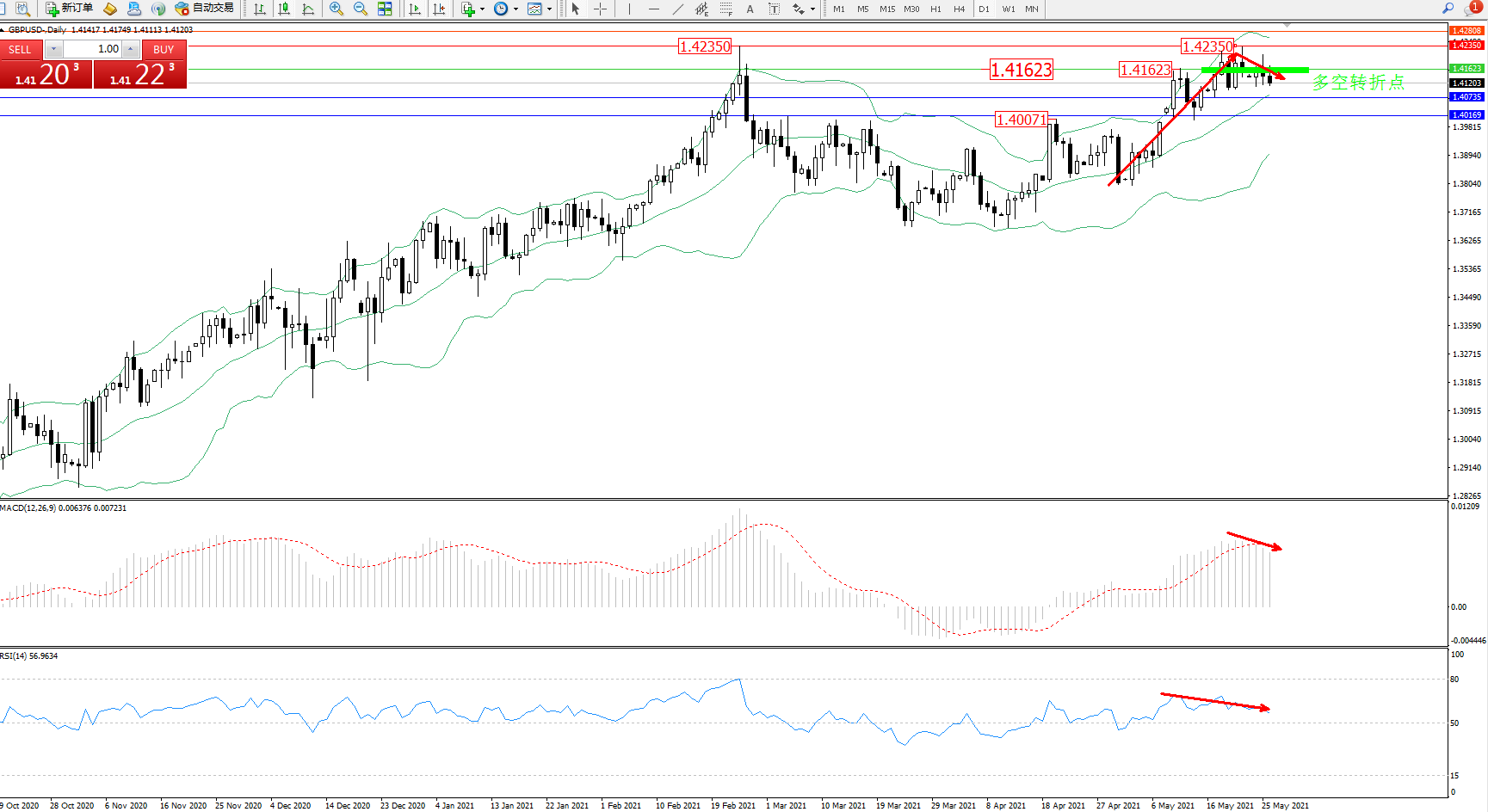 交易策略:1.41623下方看跌,目标1.40735、1.40169