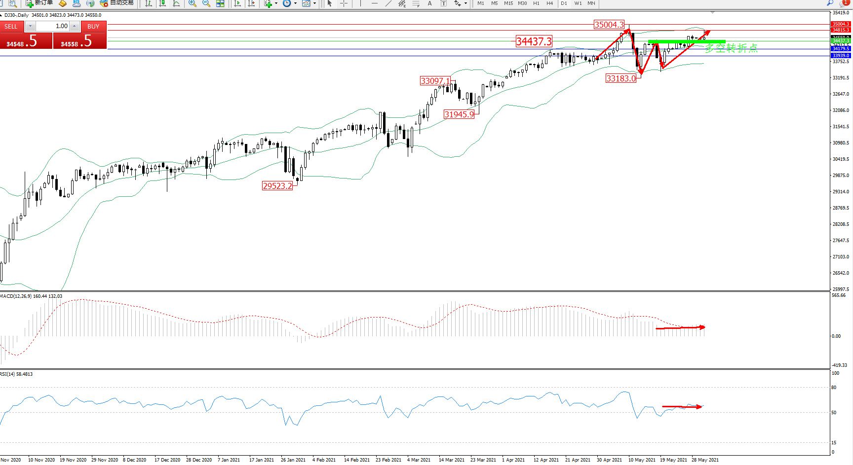 技术点评:多头动力延续布林带指标通道中上轨区间持续震荡上扬,高位抵达35004位置后遇阻回撤,长时间维持在中轨上轨弱势徘徊后终究迎来强势拉升,关注中轨附近节点,布林带指标呈收口平移走势良好,MACD指标处于多头区域高位维持震荡向下移动后弱势徘徊,RSI指标处于50均衡线上方不断震荡平移中;