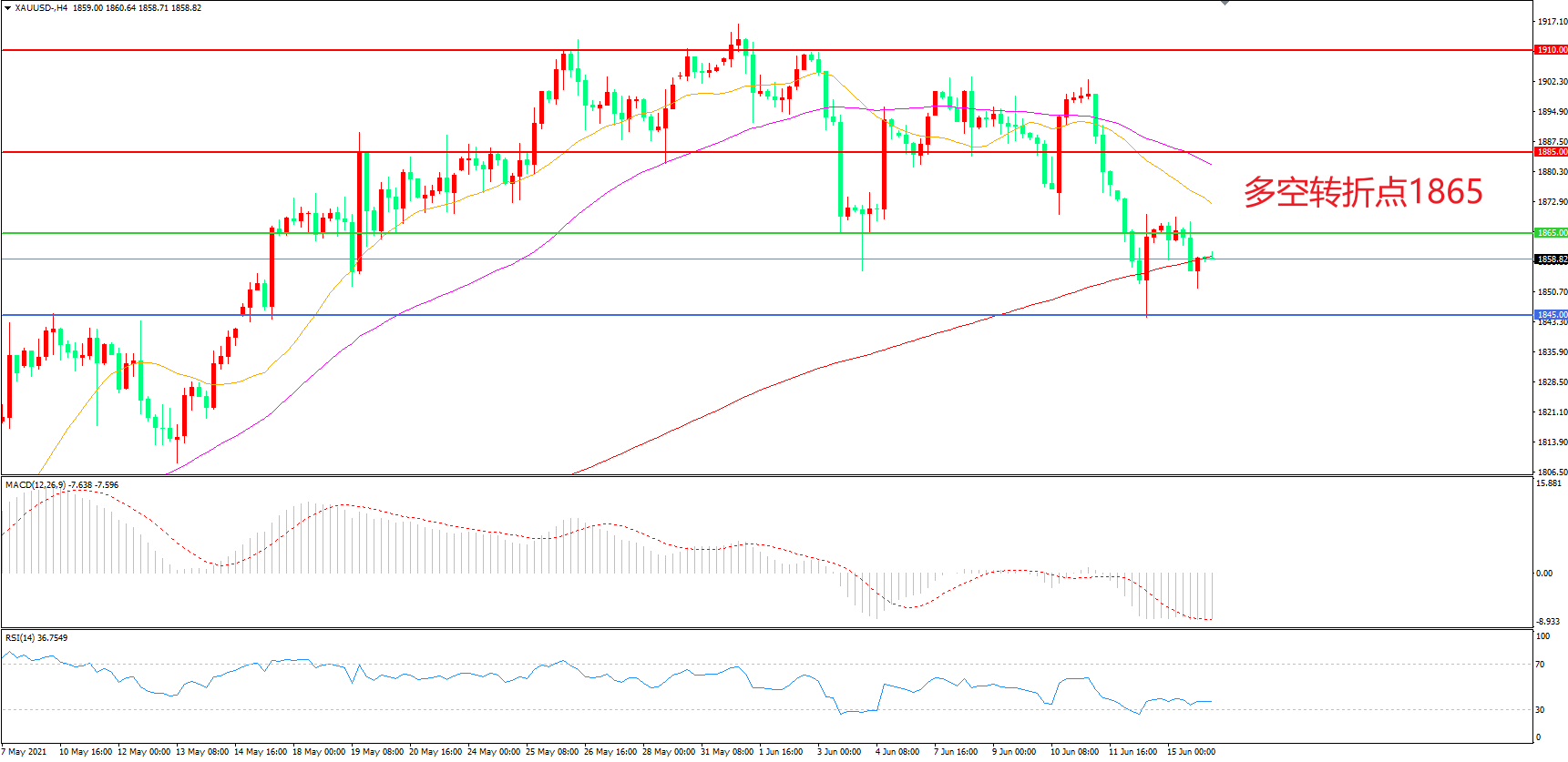 交易策略:在1865.00之下看跌,目标1845.00       1820.00