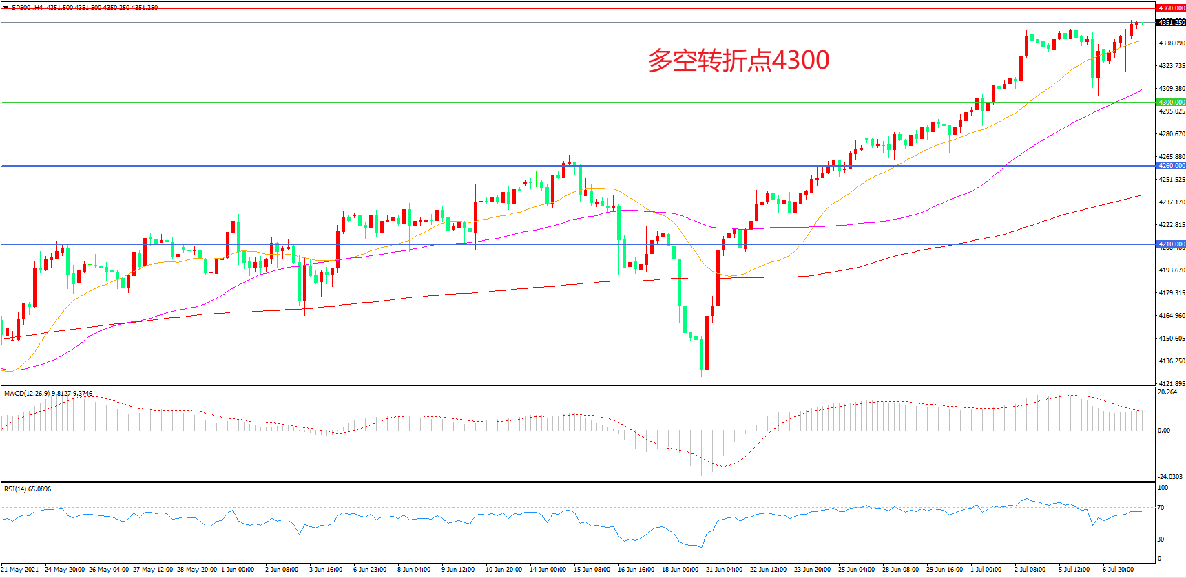 4小时图看,标普500以55周期均线为依托连续拉升,上行动力趋势明显,4300一线成为下方支撑,均线系统呈多头排列,MACD红柱减少,日内震荡上行概率较大。