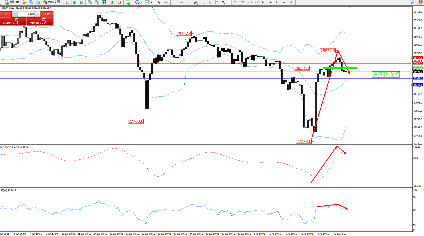 日经指数JPN225——4小时K线图显示: