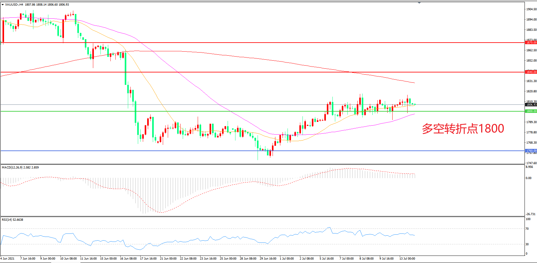 交易策略:  在1800.00之上看涨,目标1840.00        1870.00