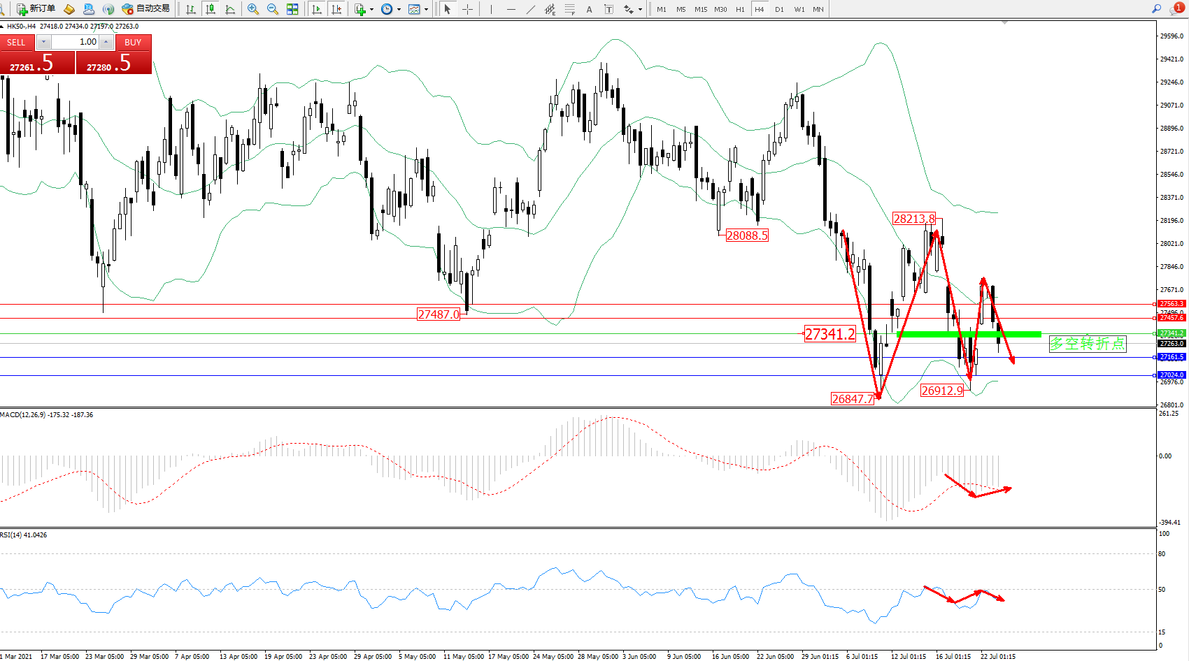 技术点评:长时间维持在布林带指标通道内持续宽幅震荡向下移动,低位中下轨区间维持巨震中,布林带指标呈收口走势持续平移中,MACD指标处于0轴线下方空头区域维持整理徘徊,RSI指标处于50均衡线下方空头区域维持震荡;
