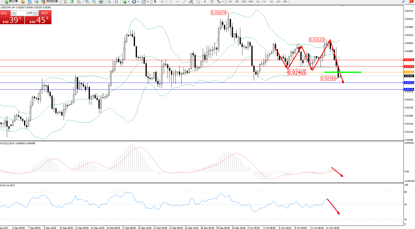 交易策略:0.92465下方看跌,目标0.92252、0.92114