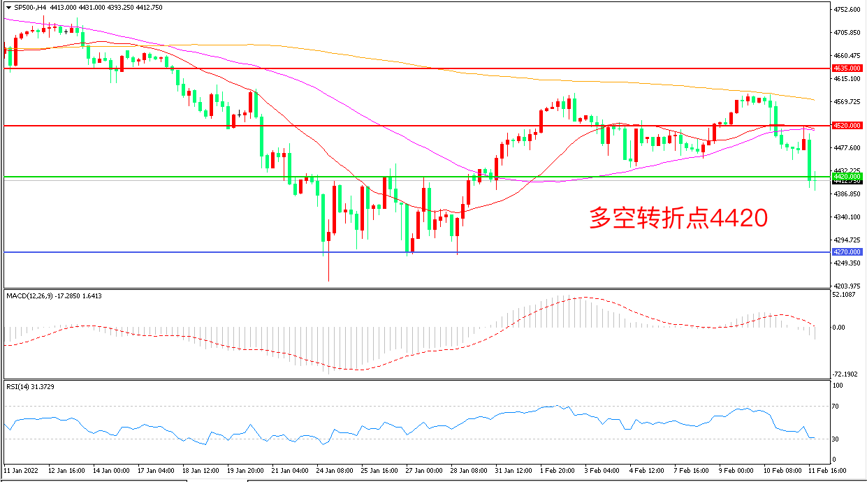 上周五(2月11日),因乌克兰东部紧张局势加剧以及美国要求其公民48小时内撤离乌克兰等消息给市场带来的恐慌情绪,美股三大股指高开低走,标普500破位下行,收报4412.75点。目前,乌俄当前紧张关系局势引发多方关注,地缘政治风险引发的避险情绪将对美股形成明显压制。