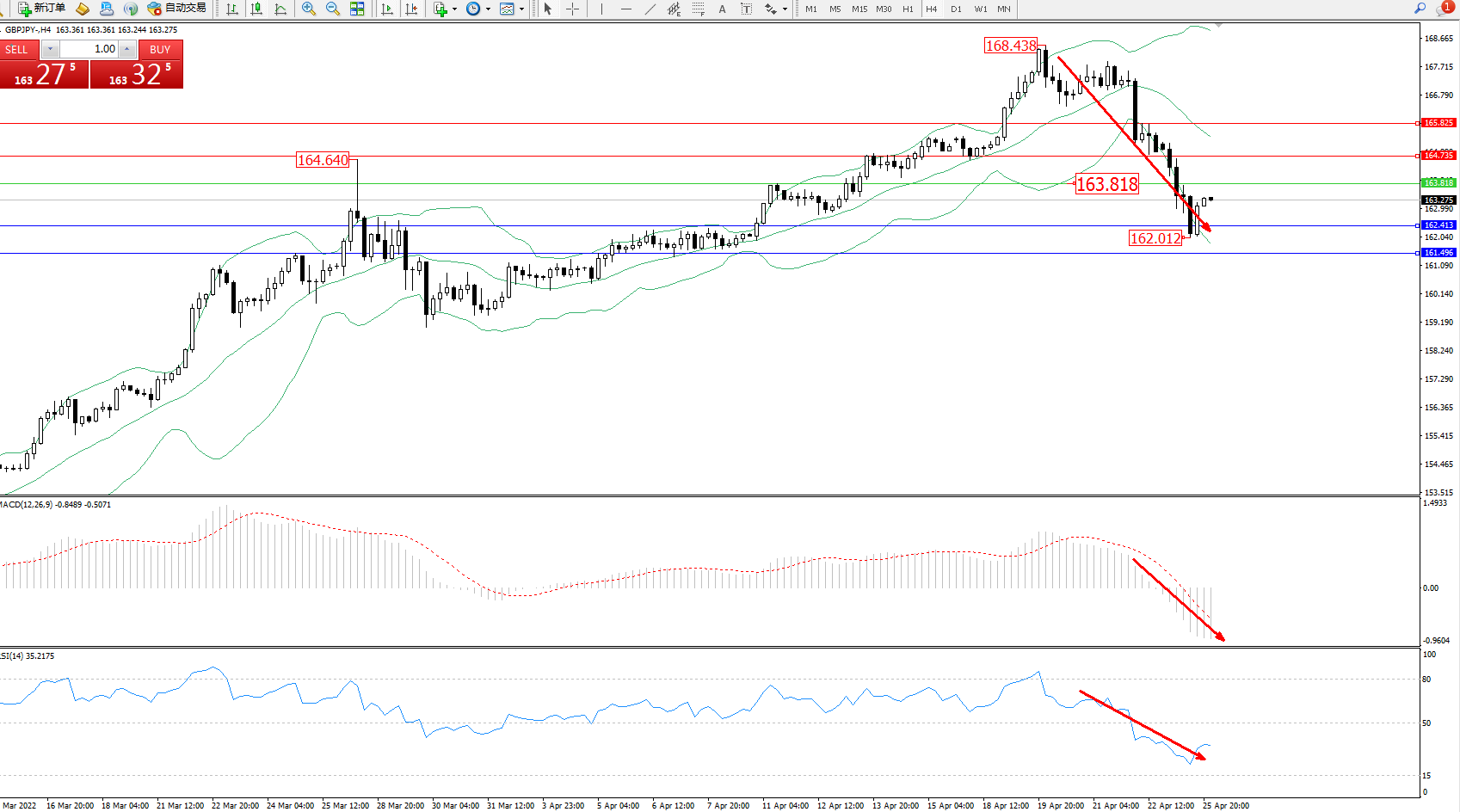 备选策略:163.818上方看涨,目标164.735、165.825