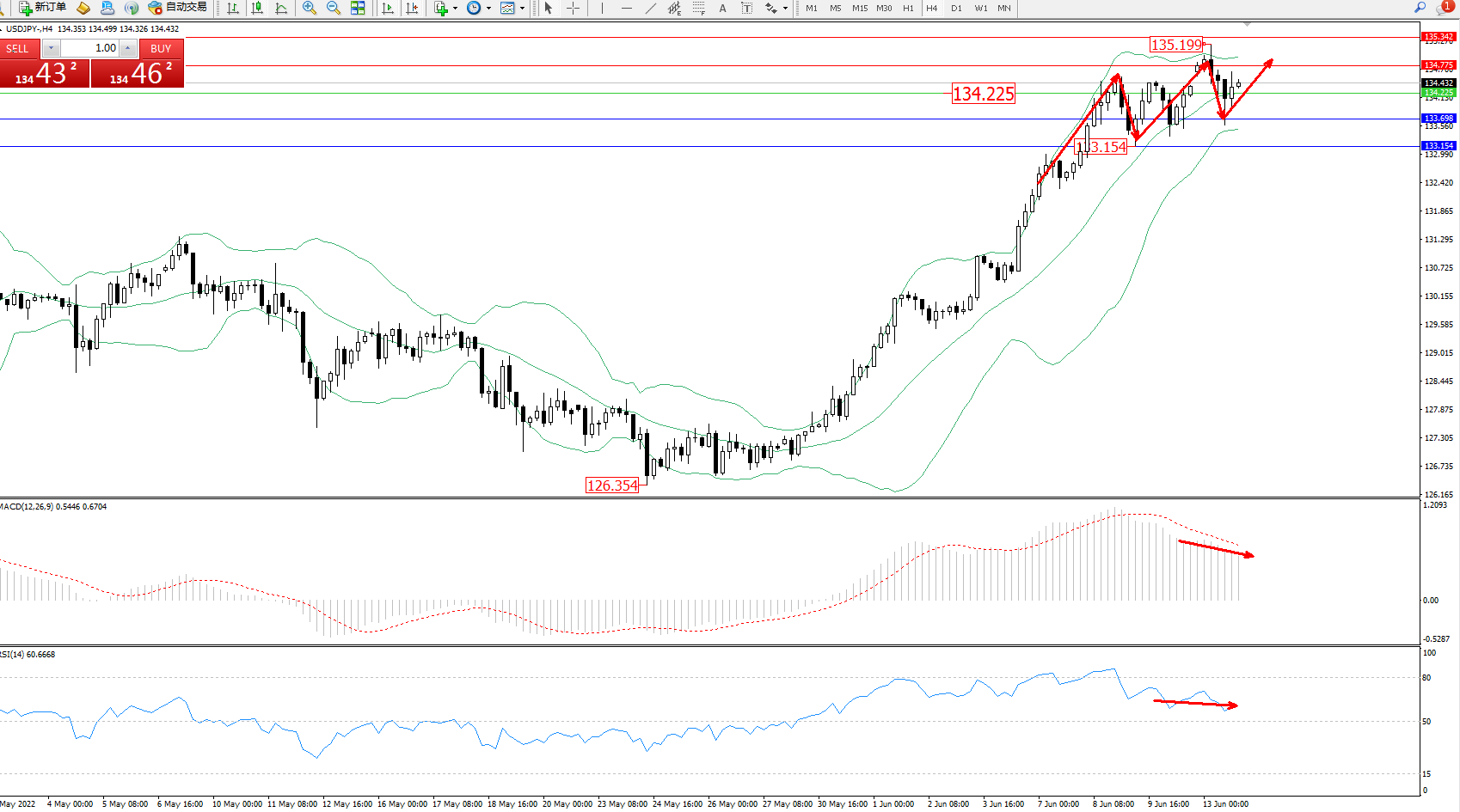 备选策略:134.225下方看跌,目标133.698、133.154
