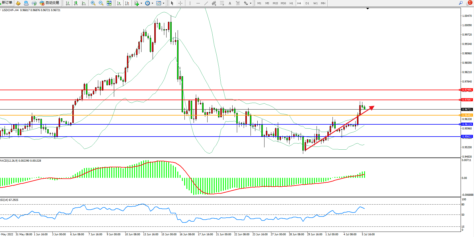 交易策略:0.96483上方看涨,目标0.97097、0.97495