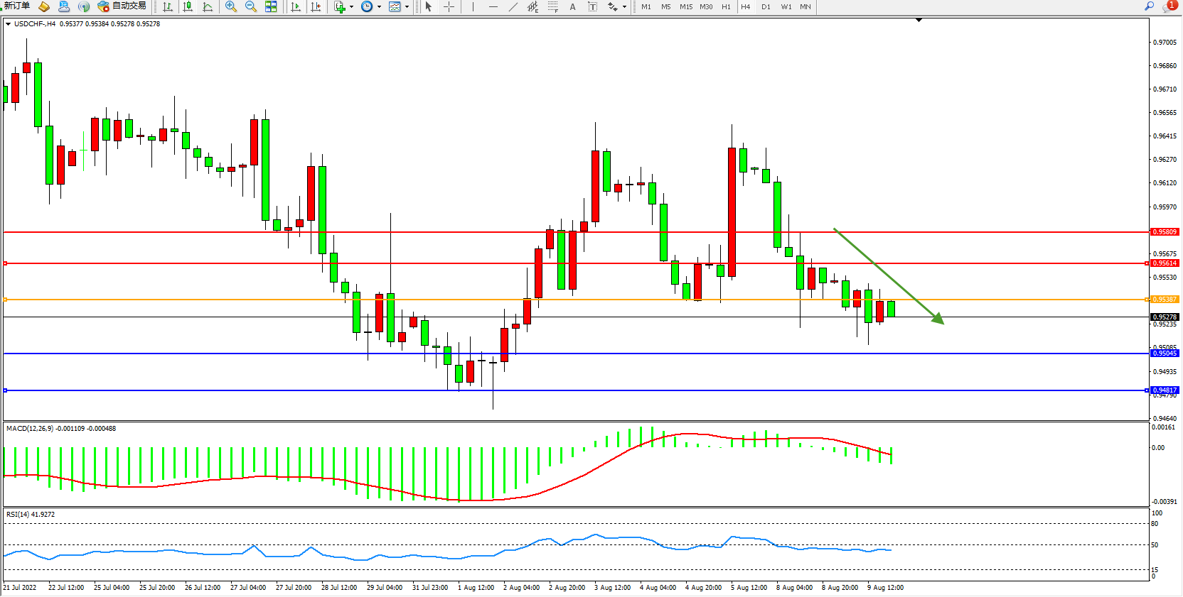 美元瑞郎USDCHF——4小时K线图显示: