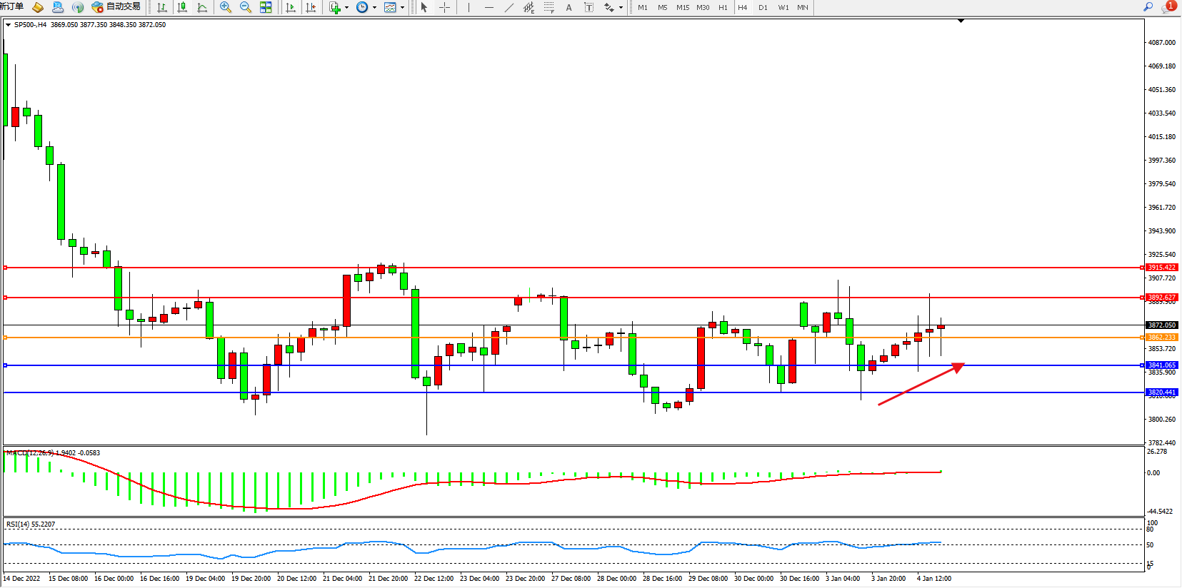 标普SP500——4小时K线图显示: