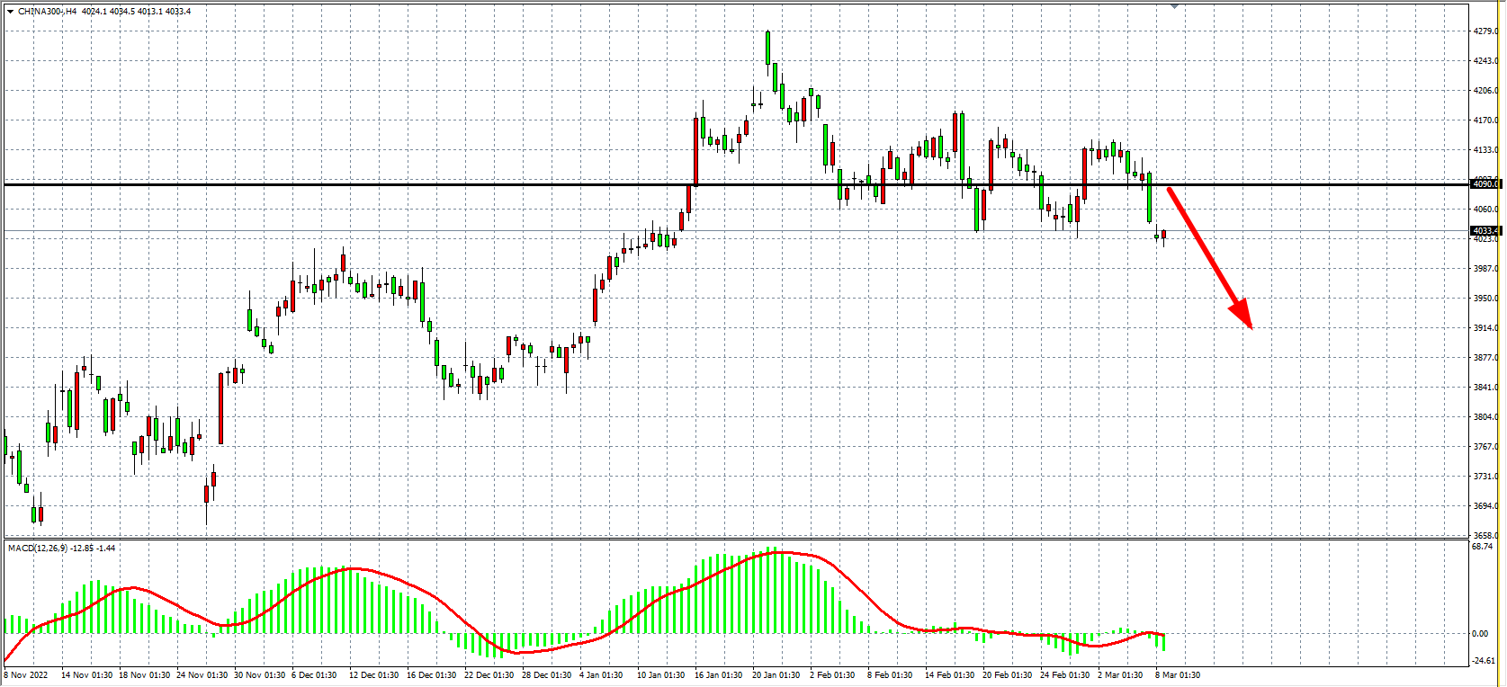 4小时图看,沪深300继续回落小幅下破4030,同时MACD于零轴之下再度放量,趋势偏向下行,阻力关注4090,在4090之下继续以看空为主,下方目标4000-3920附近。