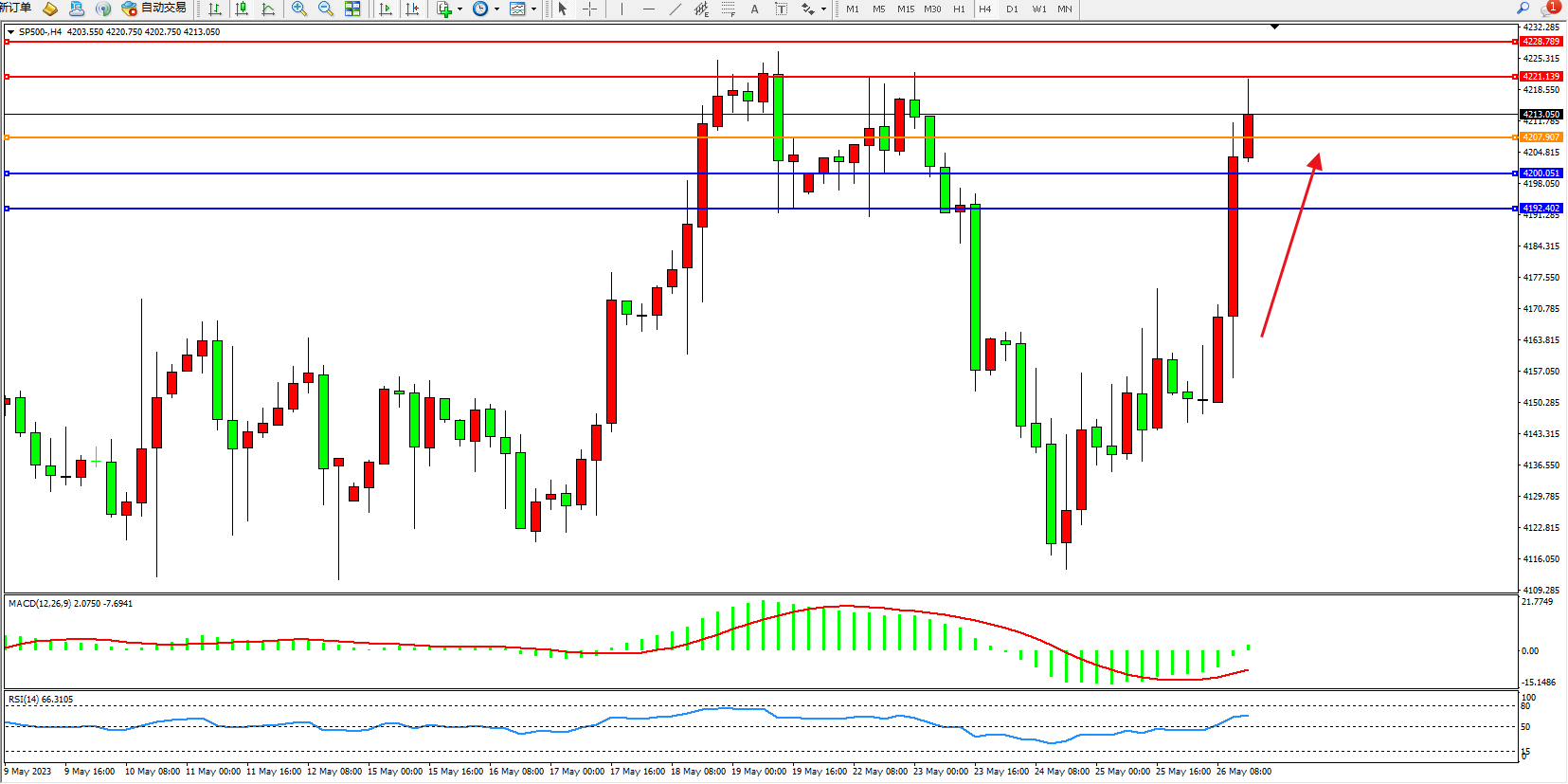 标普SP500——4小时K线图显示: