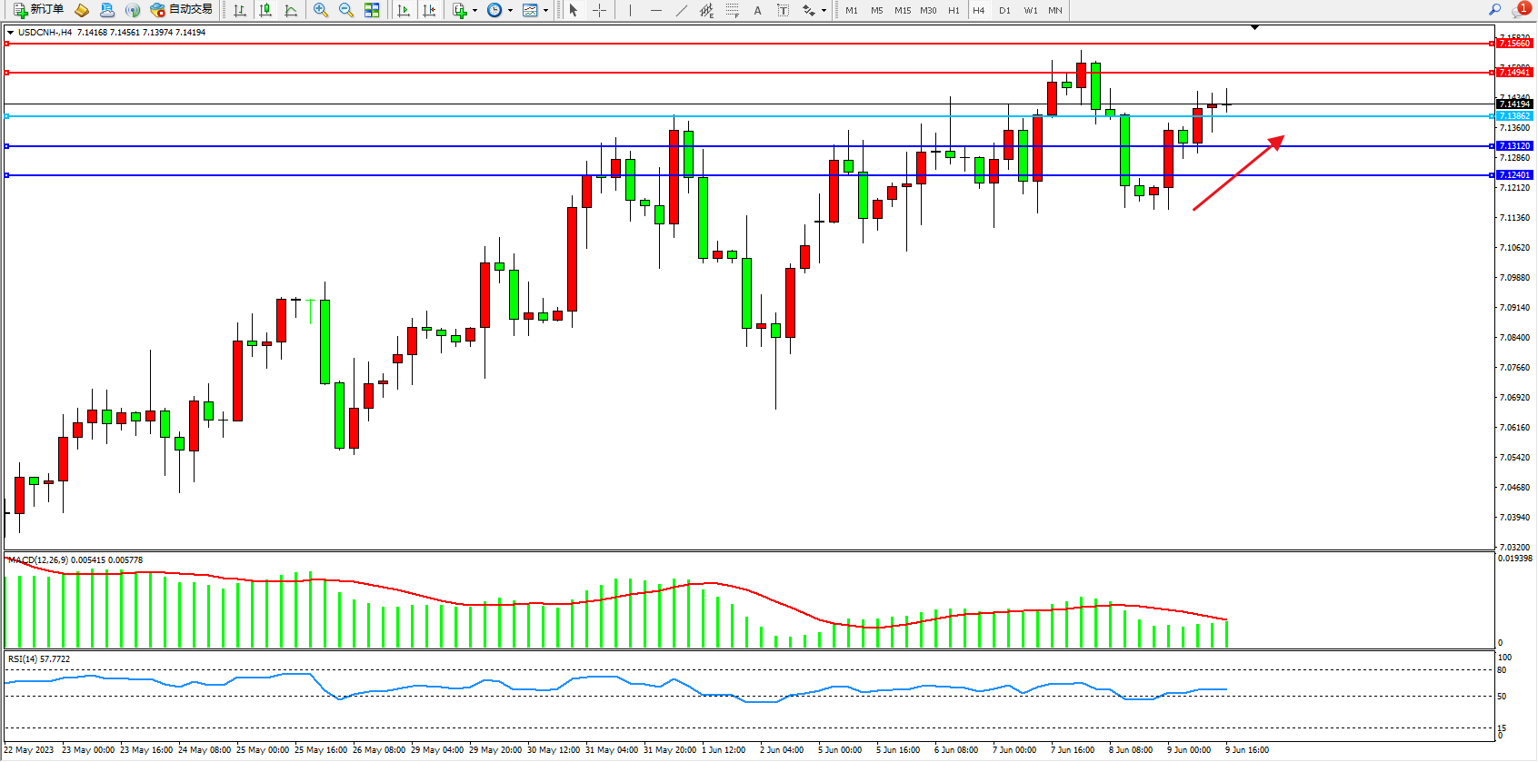 美元人民币USDCNH——4小时K线图显示: