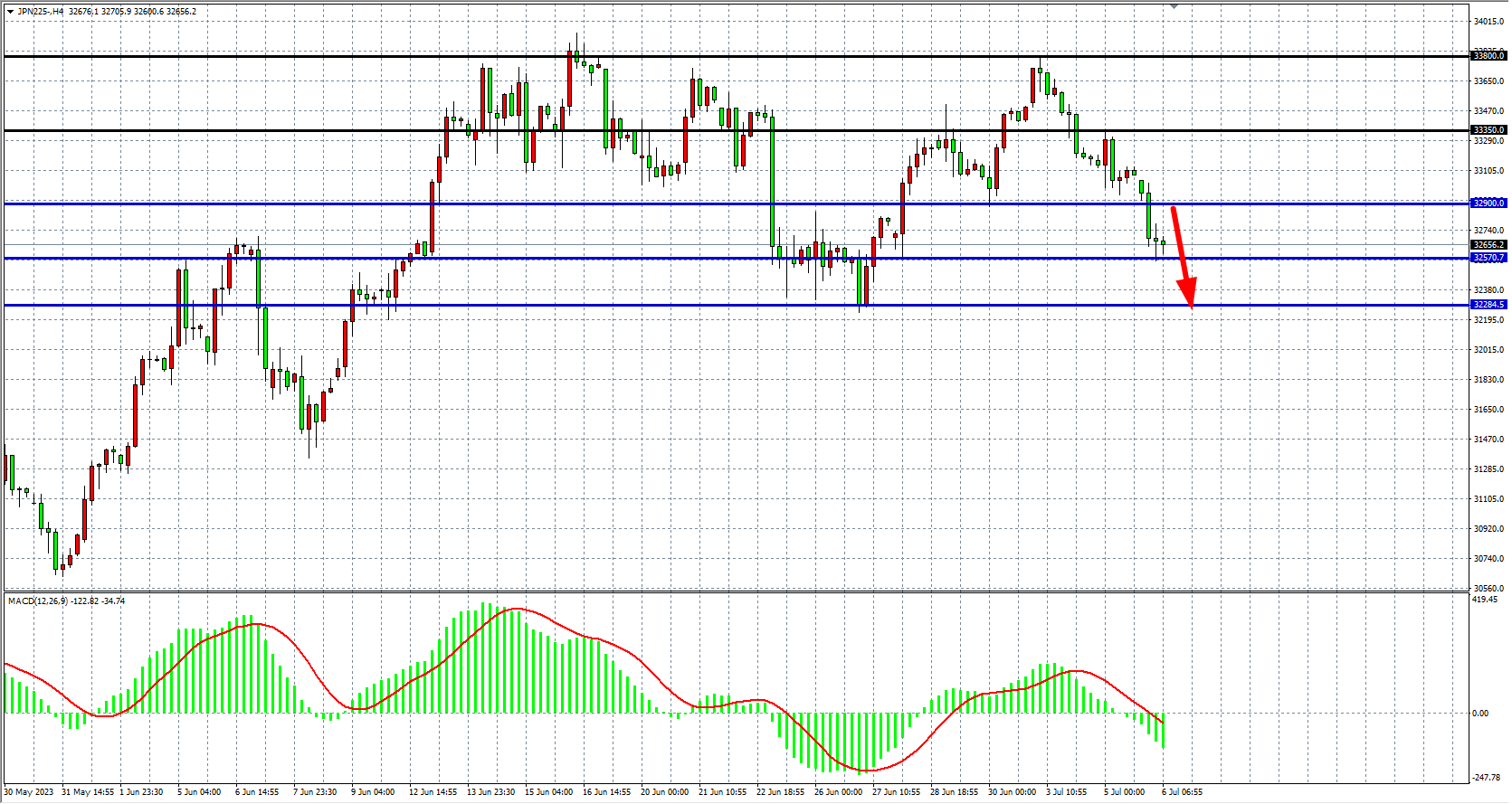 4小时图看,日经指数继续下跌破位32900,MACD量能在零轴下继续放量,空头行情延续,阻力关注32900-33300,支撑关注32500-32300。
