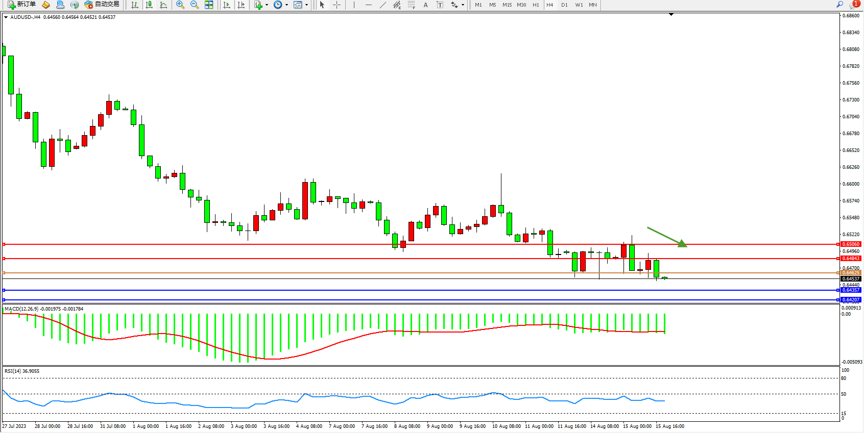 交易策略:0.64625下方看跌,目标0.64357  0.64207