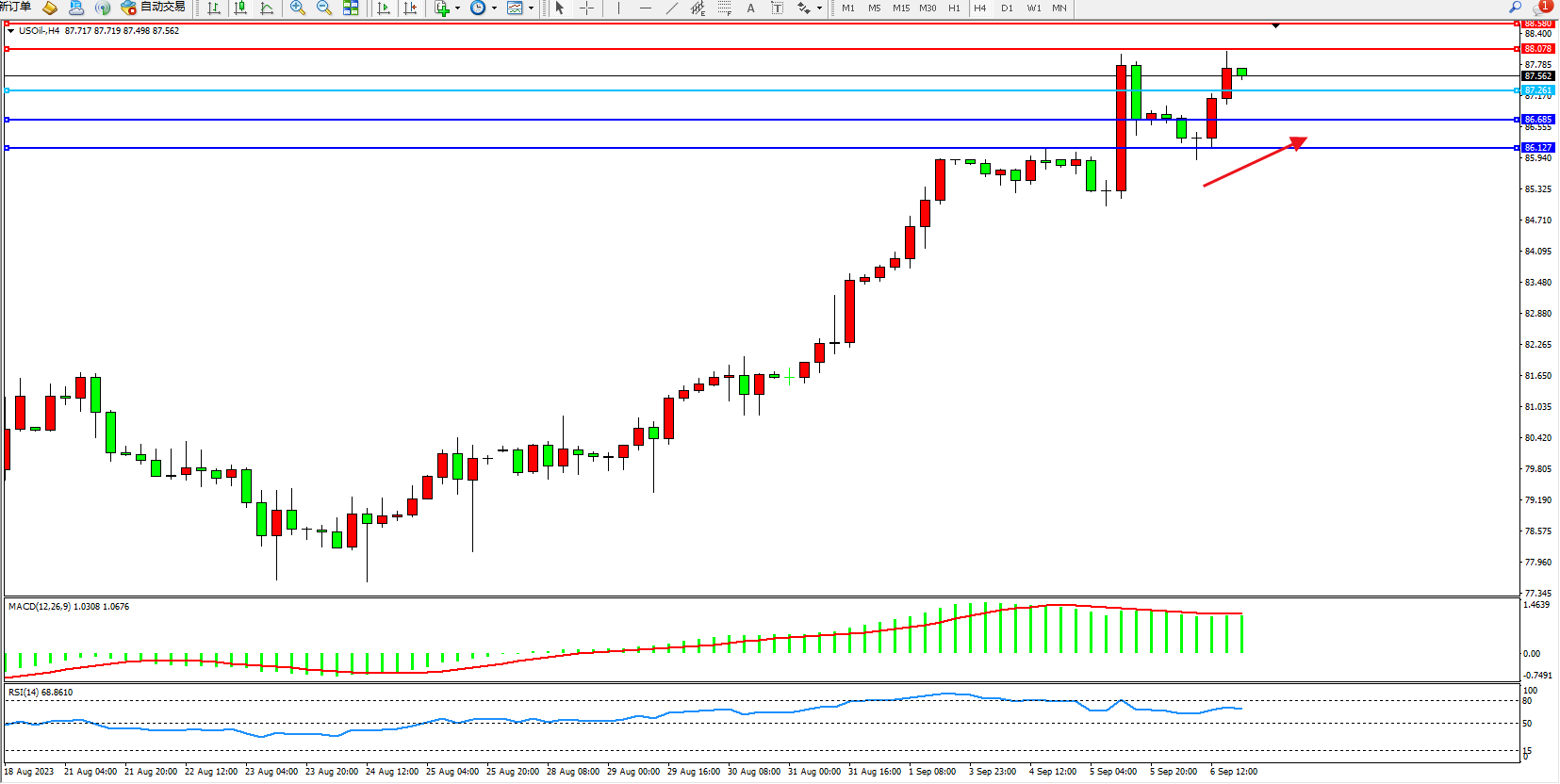 交易策略:87.261上方看涨,目标88.078 88.580