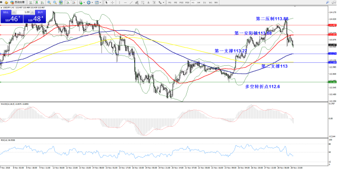 短期高位回撤中,延续布林带下轨移动,上方第一压制位于MA55均线布林带中轨下方113.68附近,第二压制113.88,第一支撑位于MA135均线113.27,第二支撑MA200均线113.00附近,多空转折点处于下方112.60附近,MACD指标进入0轴下方空头区域下行中,RSI指标在50均衡线向下移动;