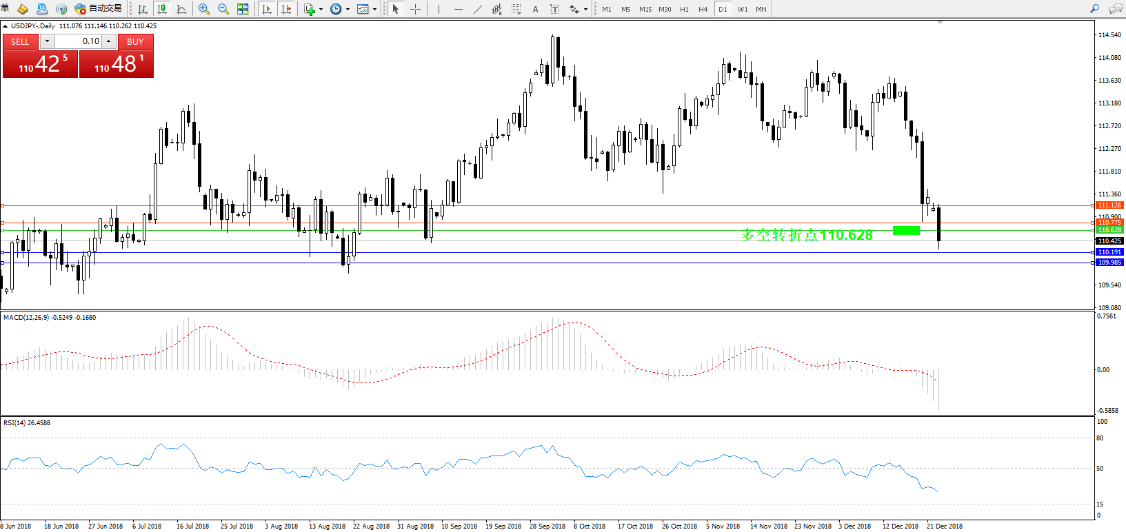 因美国政府关门可能持续到2019年元旦后。美元兑日元日内刷新自97日以来新低至110.60,跌幅超0.5%,受益于美元疲软及全球股市普遍走弱,支撑了日元的避险需求。美元兑日元面临的一个主要风险是,日本投资者没有充分对冲投资美国资产所带来的外汇风险敞口,这意味着美元兑日元的损失可能会随着投资者的恐慌和撤离而导致更大的损失;日益增多的未对冲日本和美国敞口增加了日本海外资产风险敞口,只要外汇波动保持温和,这种上升就没有问题,但一旦外汇波动加剧,可能导致资产清算。