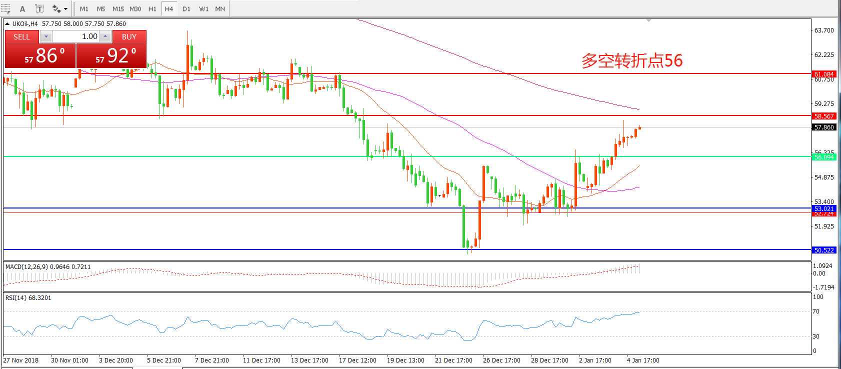 4小时图看,油价站稳56美金后稳步上行, 21与55均线形成金叉,MACD红柱增加,RSI指标拐头,日内反弹概率较大。
