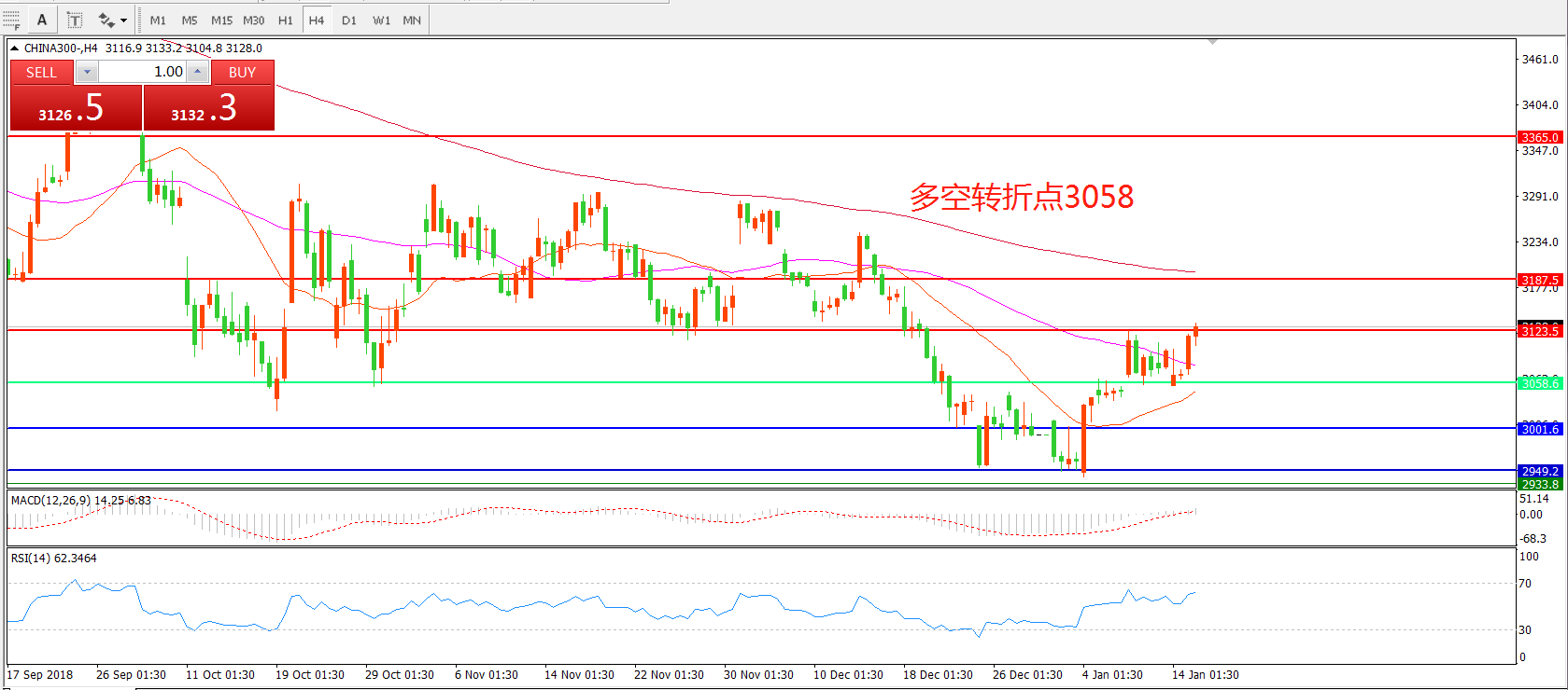 4小时图看,CHINA300中华指数站稳3058后陷入整理,日内如能站稳3123一线,反弹趋势即可确立, MACD绿柱减少,红柱增加,短期反弹成为可能。