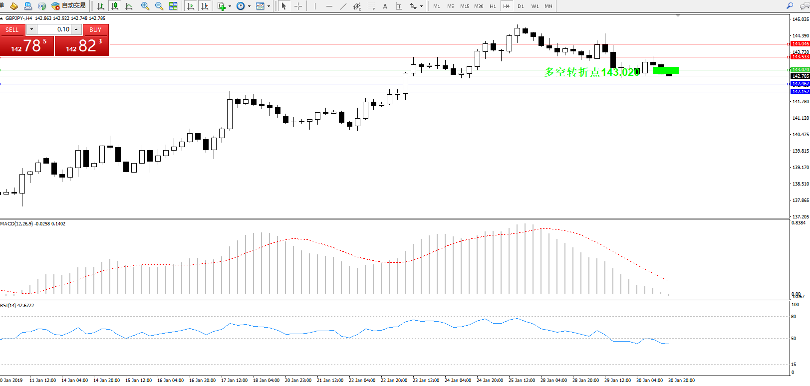 交易策略:143.020下方看跌,目标142.467、142.152