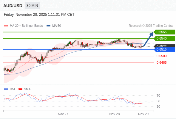 在 0.6515 之上,看涨,目标价位为 0.6540 ,然后为 0.6555 。