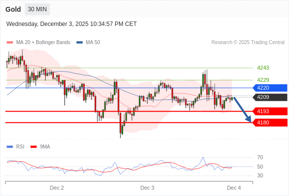 在 4220 之下,看跌,目标价位为 4193 ,然后为 4180 。