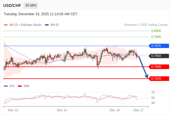 在 0.7975 之下,看跌,目标价位为 0.7940 ,然后为 0.7920 。
