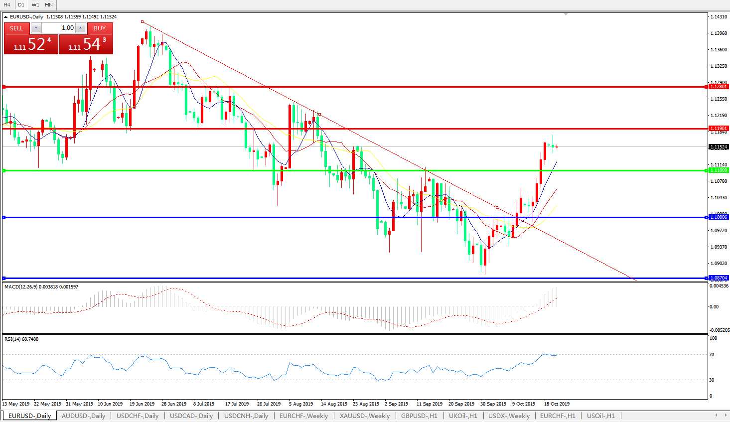 技术面简析:日图均线维持有序多头排列,汇价继续上行一度逼近1.1190关口后回落,MACD上破0轴且量能0轴上放加速放量,RSI触及超买区域后走平,预计短期汇价存进一步上行空间,但上方压制逐步显现。