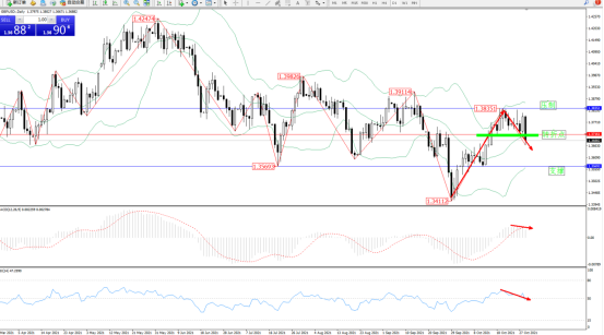 低位多头动力持续震荡上扬,高位抵达1.38351位置遇阻回撤,纠结于布林带指标中轨附近节点后有继续回撤下移迹象,布林带指标呈上行走势持续收口中,上方压制关注1.38351位置,低位支撑关注1.35693位置,关注中轨1.37161位置支撑节点,MACD指标处于0轴线上方多头区域维持整理平移,RSI指标处于多头区域窄幅整理回撤至50均衡线附近徘徊,如图: