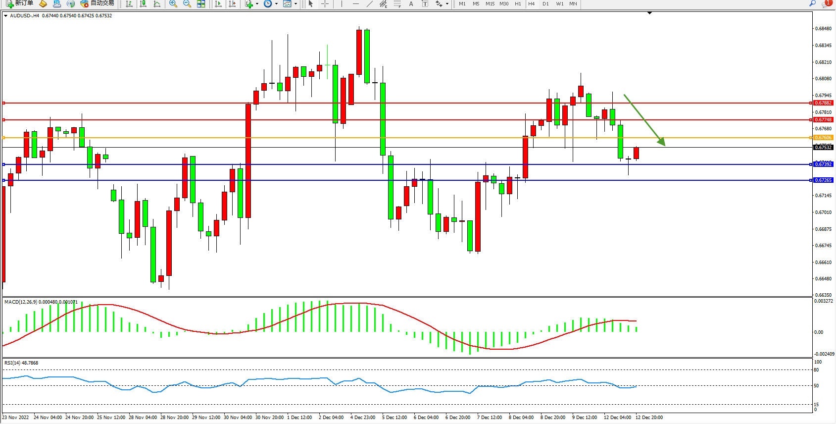 澳元美元AUDUSD——4小时K线图显示:
