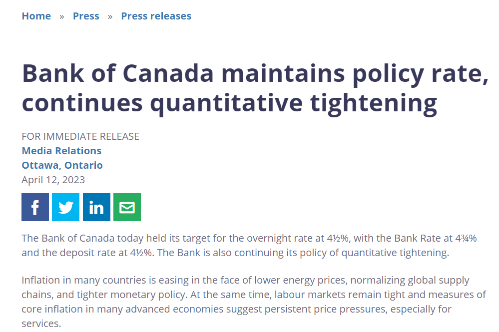 加拿大央行在上个月已经率先采取了按兵不动的举措,成为了头一个停下加息脚步的全球主要央行。