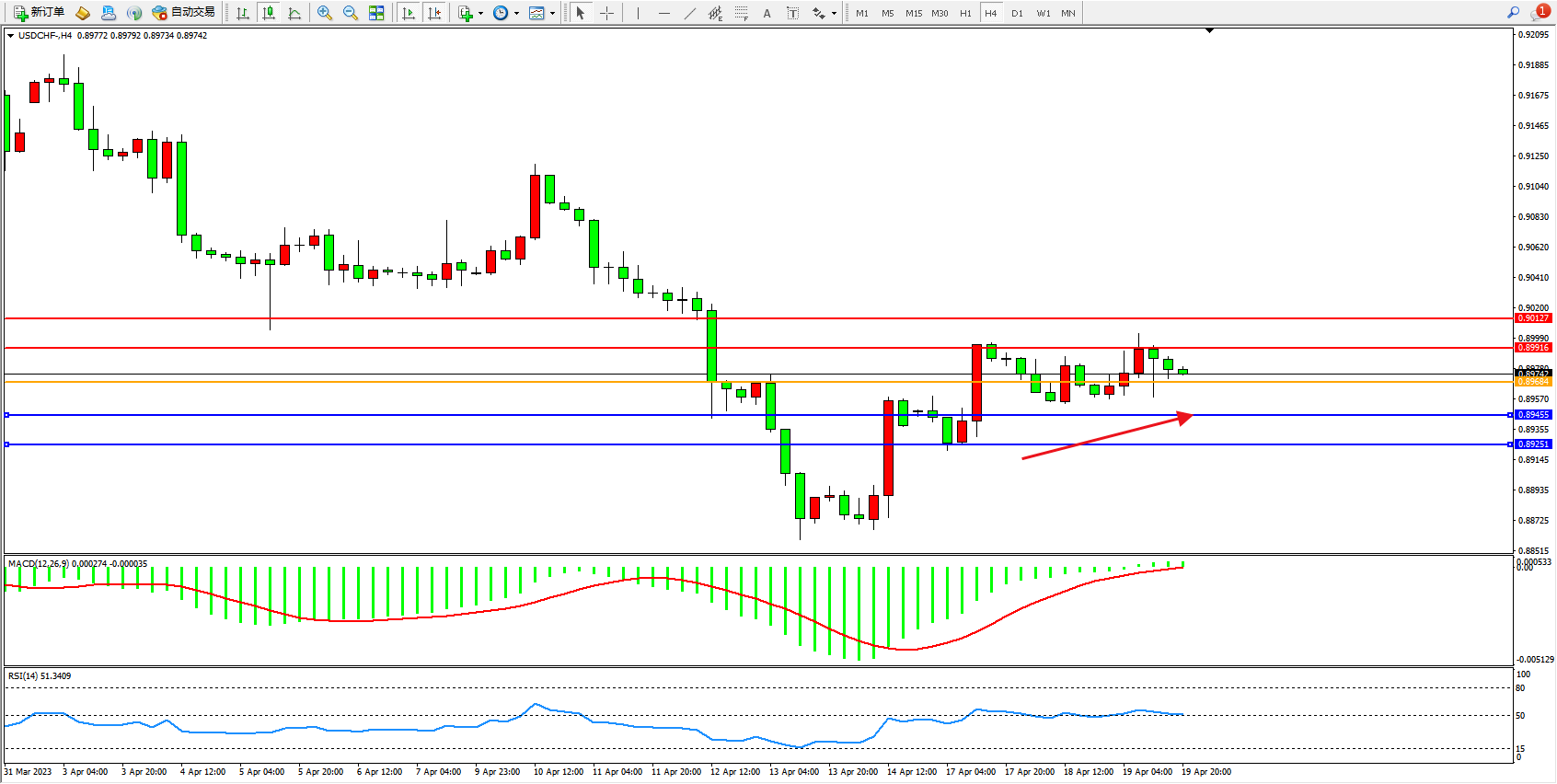 美元瑞郎USDCHF——4小时K线图显示: