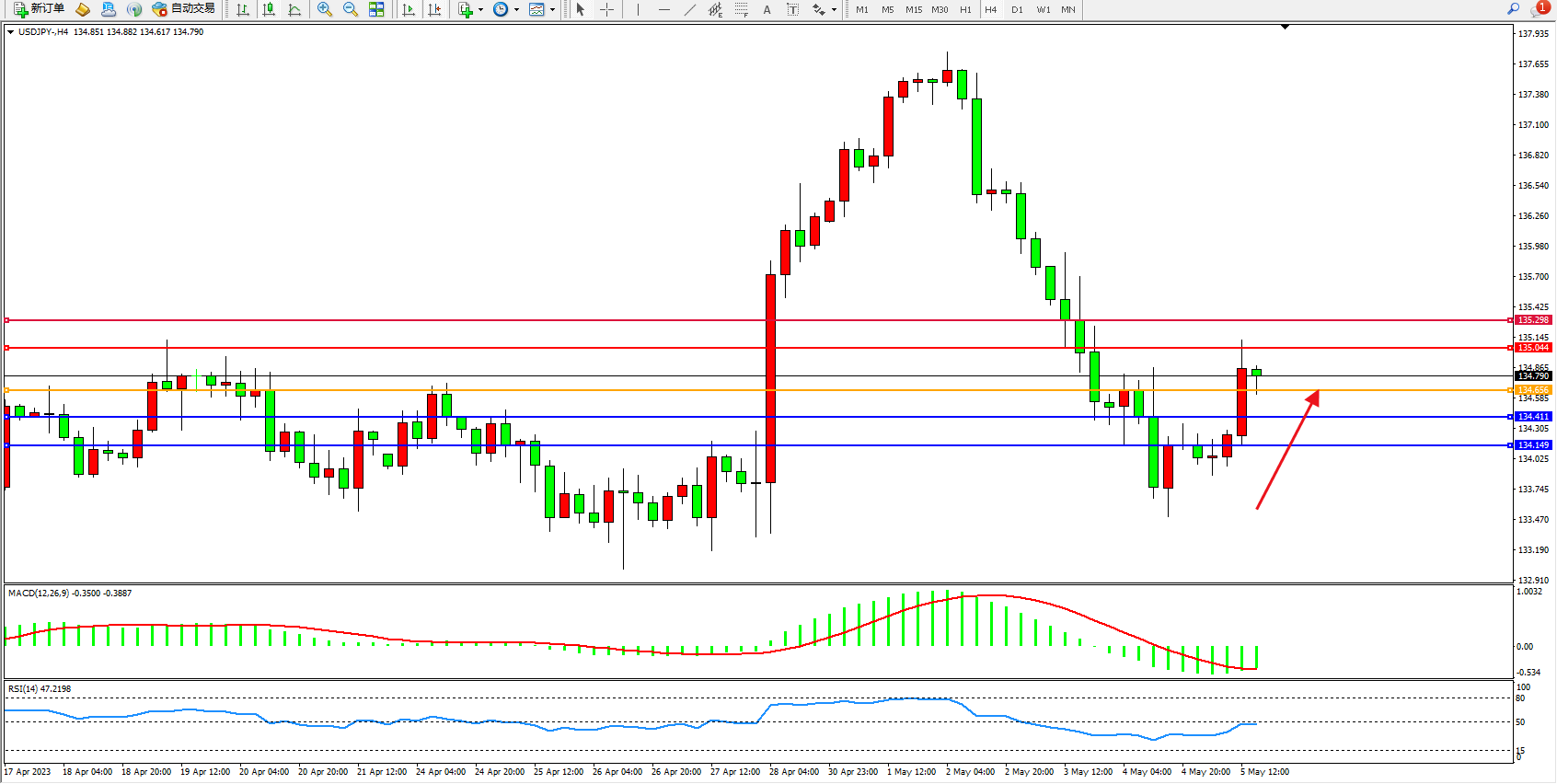 4小时图看:低位多头动力维持震荡拉升,短期看涨情绪笼罩,市场多头不断上移中,MACD指标处于空头区域整理平移,RSI指标处于50均衡线附近弱势徘徊;