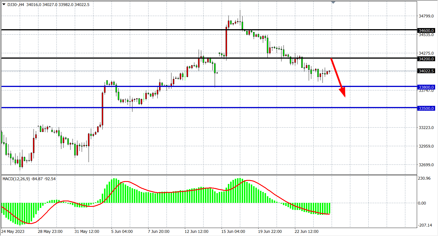 4小时图看,道指延续弱势在3400附近徘徊,MACD量能在零轴下均匀放量,空头趋势占优,下方支撑33800-33500,上方阻力34200-34600。